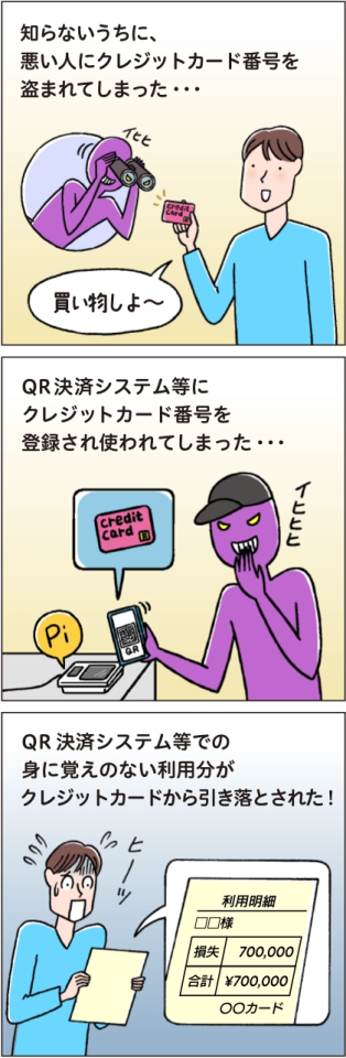 自分の財布を盗まれて、その中に入っていたクレジットカード情報を他の誰かのQR決済システムに登録されて、クレジットカードが使用されてしまった。