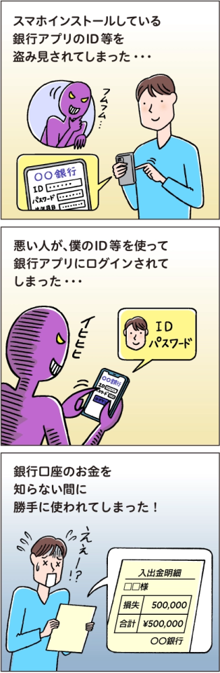 自分の銀行アプリのID等を入力をしているところを第三者に見られ、そのIDを他のスマートフォンにインストールされた銀行アプリに入力をされ、自分の口座のお金を他の誰かに送金されてしまった。