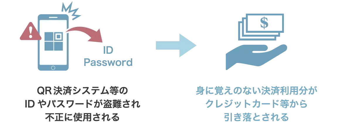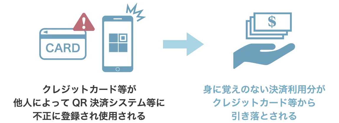 自分のQRシステムのID情報を隣にいた誰かに覗き見られて、他の誰かのスマートフォンにインストールされたQR決済システムに入力がされ、使われてしまった結果、自分のクレジットカードから引き落としがされた。