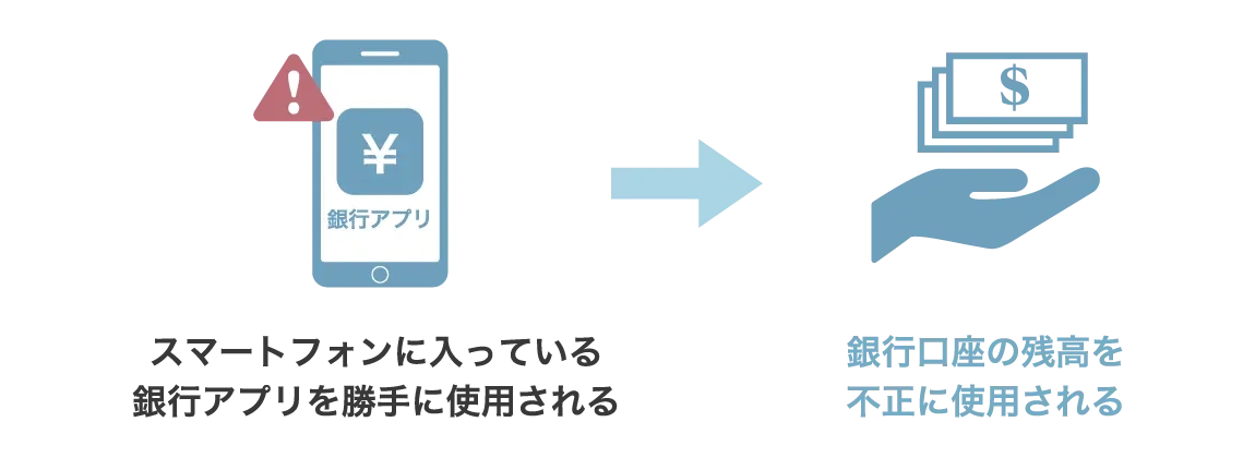 自分のスマートフォンを他人に盗まれて、インストールされていた銀行アプリを使用されて、自分の口座のお金を他の誰かに送金をされてしまった。